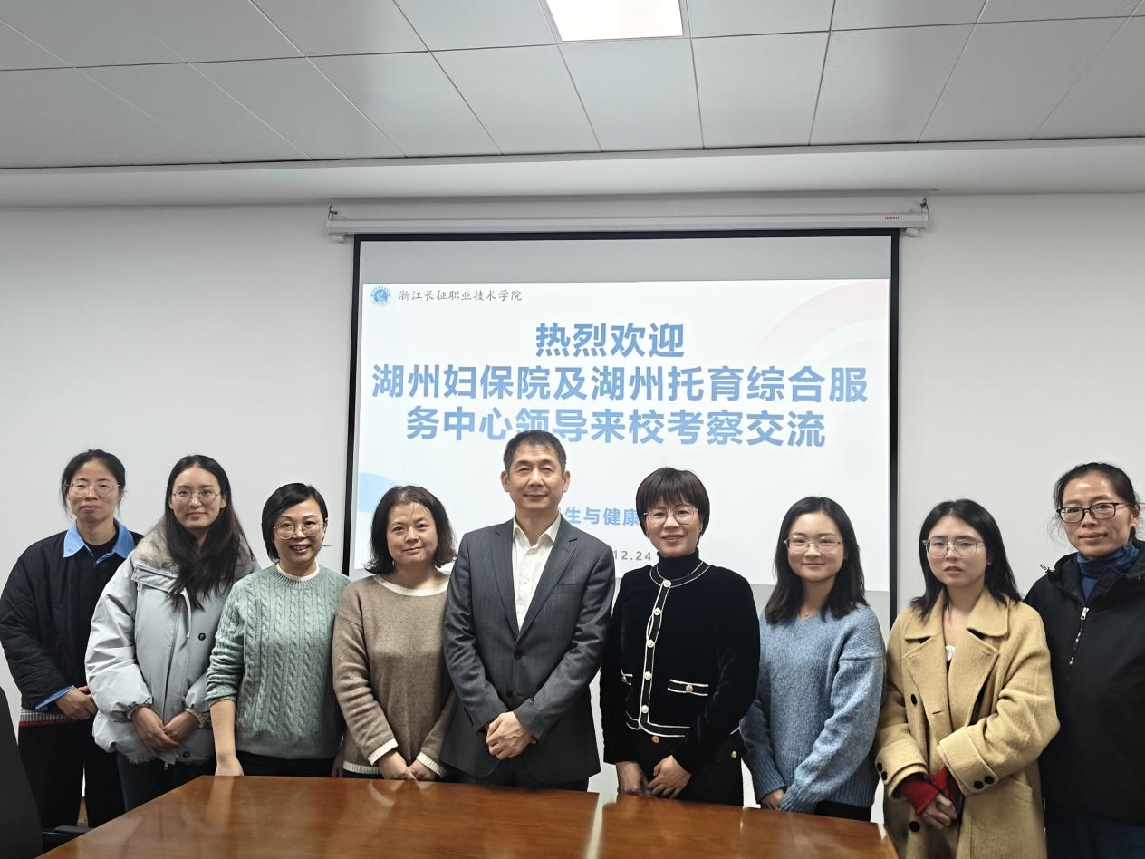 近日,湖州市托育综合服务中心主任、湖州市福宝托育公司经理居星耀,湖州市托育综合服务中心副主任蒋琦,湖州市福宝托育园执行园长谈卢霞一行莅临我校考察交流。卫生与健康学院常务副院长葛玲妹、婴幼儿托育服务与管理教研室主任周怡妙及相关专任教师、辅导员参加座谈。双方围绕深化校企合作、共同培养托育人才进行了深入交流。